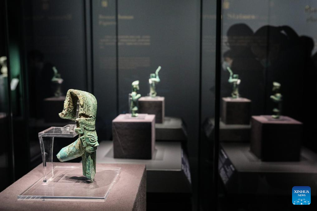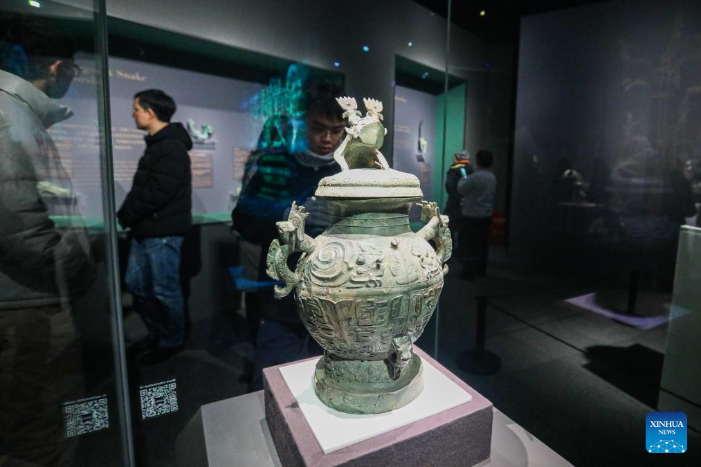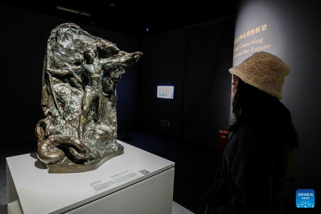People visit an exhibition titled "Glory of Bronze Civilization" in the Museum of Shanghai University in Shanghai, east China, Dec. 22, 2023. The exhibition features sculptures by the French sculptor Auguste Rodin and bronze relics from China's Sanxingdui Ruins. (Xinhua/Xin Mengchen)