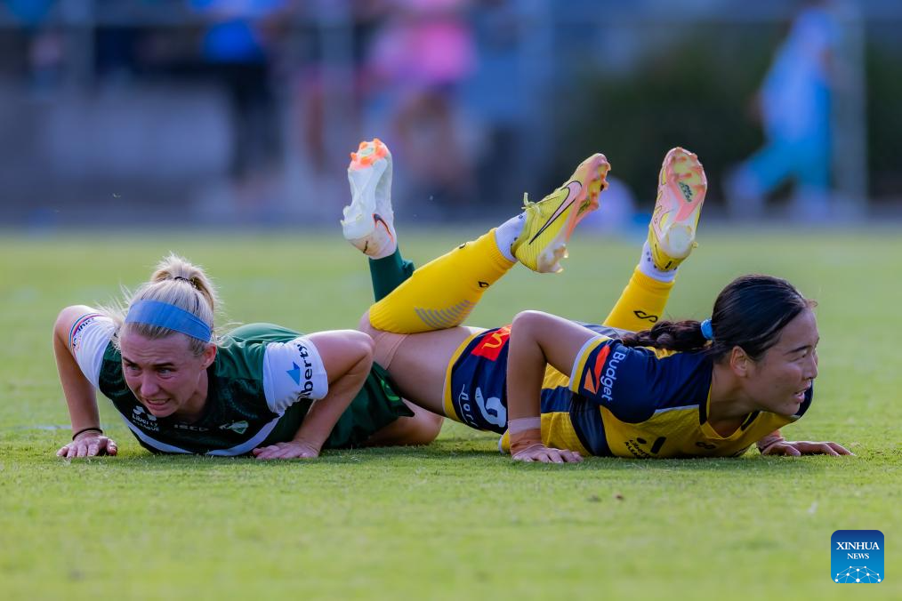 Chinese football player Wurigumula (R) of Central Coast Mariners competes during the 2023-2024 season A-League Women 9th round match between Canberra United and Central Coast Mariners in Canberra, Australia, Dec. 23, 2023. (Photo by Chu Chen/Xinhua)