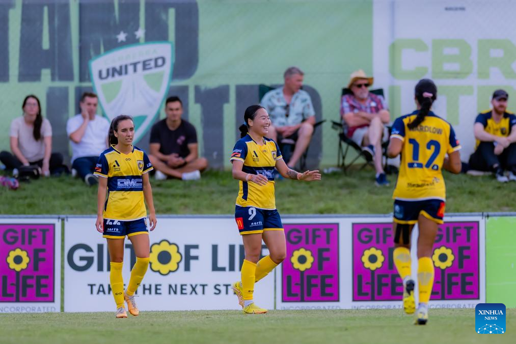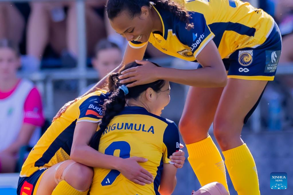 Chinese football player Wurigumula (C) of Central Coast Mariners reacts after scoring during the 2023-2024 season A-League Women 9th round match between Canberra United and Central Coast Mariners in Canberra, Australia, Dec. 23, 2023. (Photo by Chu Chen/Xinhua)