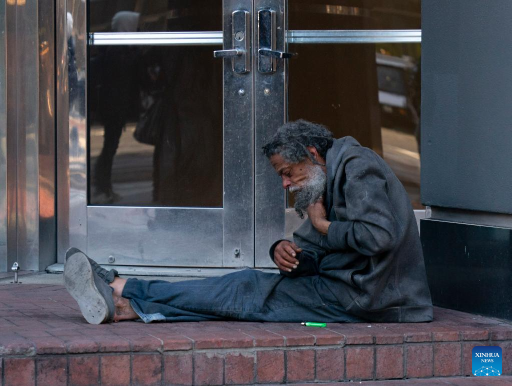 A homeless man is pictured in San Francisco, California, the United States, Dec. 23, 2023. The number of homeless people in the United States has increased by 12 percent to a record high, showed a government report on Dec. 15. (Photo by Li Jianguo/Xinhua)