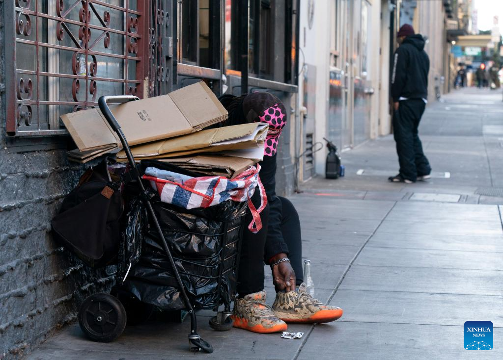 A homeless person is pictured in San Francisco, California, the United States, Dec. 23, 2023. The number of homeless people in the United States has increased by 12 percent to a record high, showed a government report on Dec. 15. (Photo by Li Jianguo/Xinhua)
