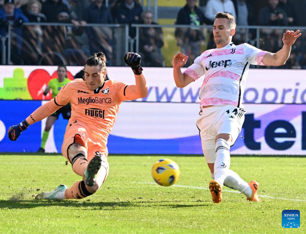 FC Juventus's Arkadiusz Milik (R) vies with Frosinone's goalkeeper Stefano Turati during a Serie A match between Frosinone and FC Juventus in Frosinone, Italy, Dec. 23, 2023. (Photo by Alberto Lingria/Xinhua)