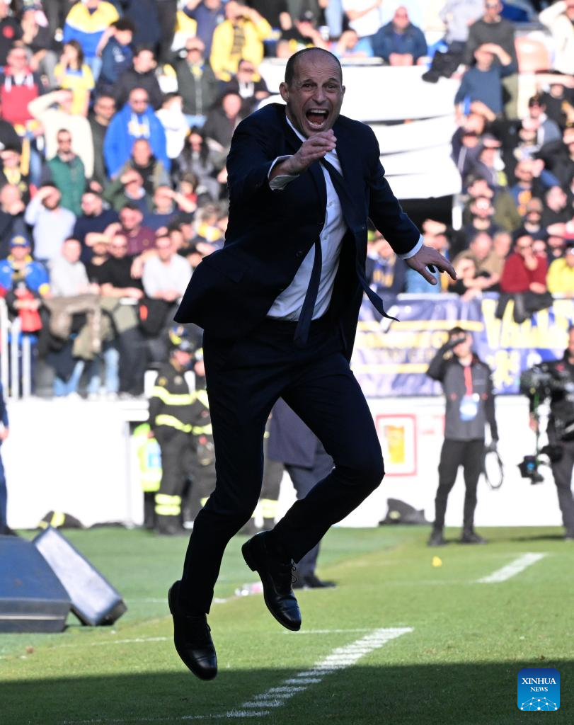 FC Juventus's head coach Massimiliano Allegri reacts during a Serie A match between Frosinone and FC Juventus in Frosinone, Italy, Dec. 23, 2023. (Photo by Alberto Lingria/Xinhua)