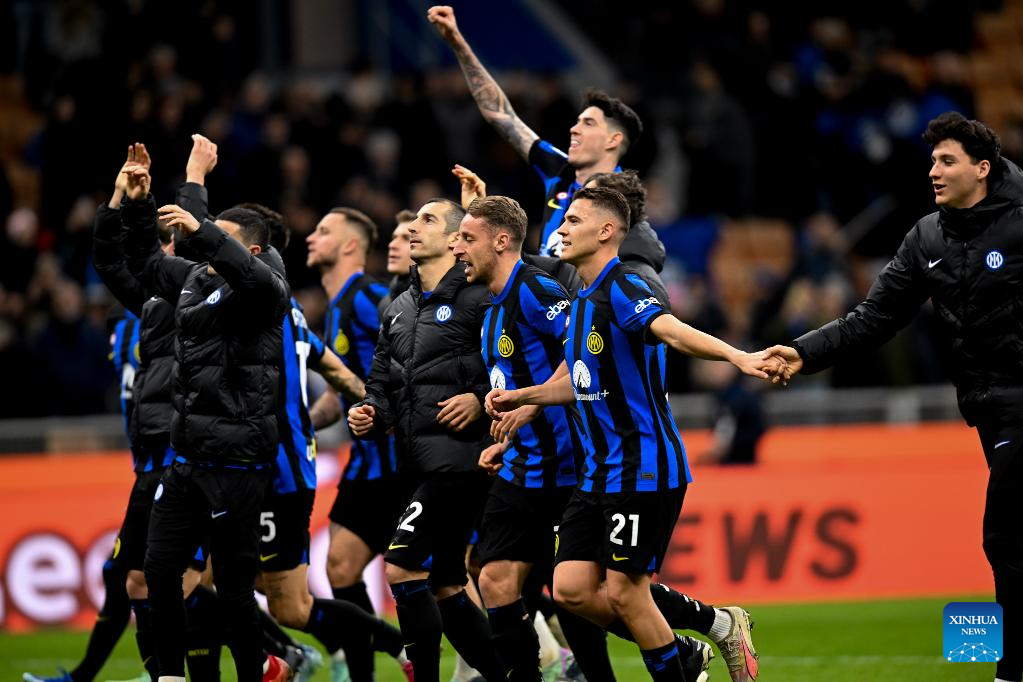 FC Inter's players celebrate at the end of the Serie A soccer match between FC Inter and Lecce in Milan, Italy, Dec. 23, 2023. (Photo by Valeria Abis/Xinhua)