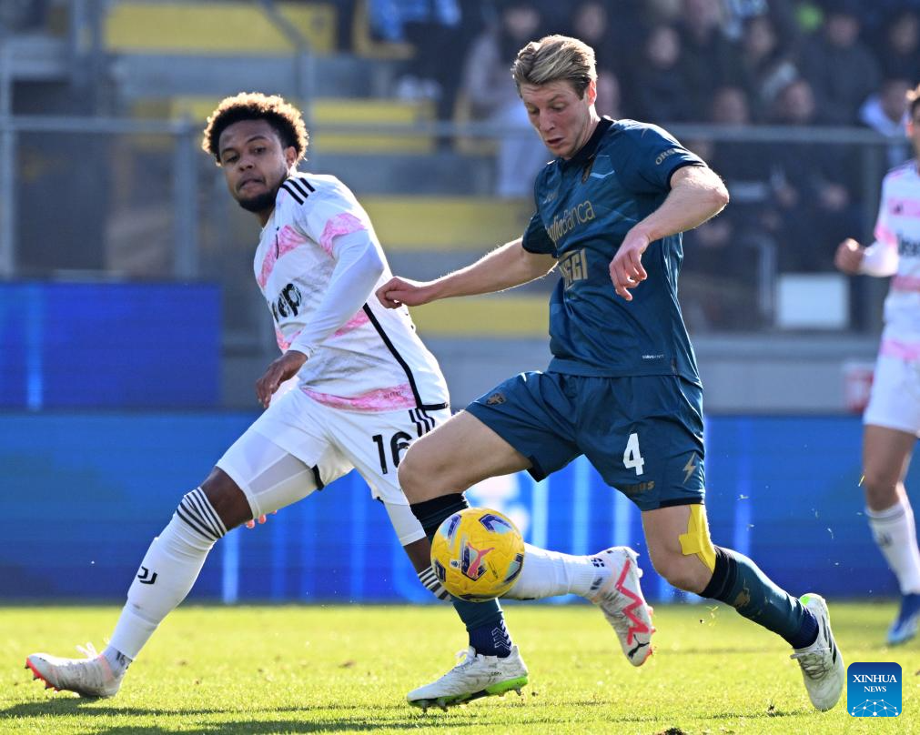 FC Juventus's Weston Mckennie (L) vies with Frosinone's Marco Brescianini during a Serie A match between Frosinone and FC Juventus in Frosinone, Italy, Dec. 23, 2023. (Photo by Alberto Lingria/Xinhua)