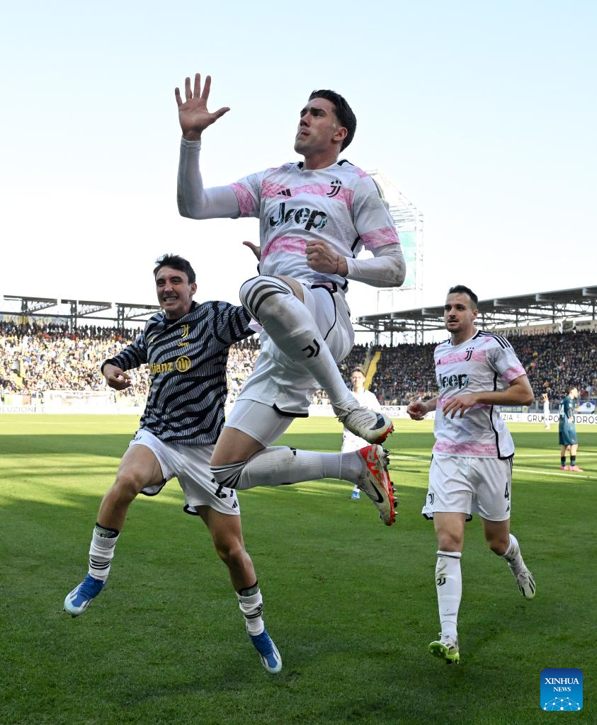 FC Juventus's Dusan Vlahovic (top) celebrates his goal during a Serie A match between Frosinone and FC Juventus in Frosinone, Italy, Dec. 23, 2023. (Photo by Alberto Lingria/Xinhua)