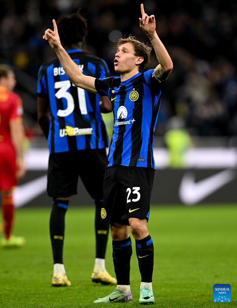 FC Inter's Nicolo Barella celebrates his goal during the Serie A soccer match between FC Inter and Lecce in Milan, Italy, Dec. 23, 2023. (Photo by Valeria Abis/Xinhua)