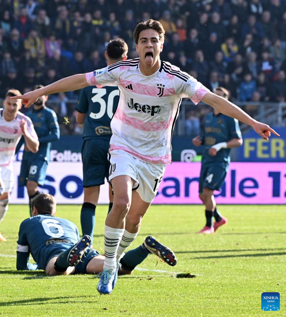 FC Juventus's Kenan Yildiz celebrates his goal during a Serie A match between Frosinone and FC Juventus in Frosinone, Italy, Dec. 23, 2023. (Photo by Alberto Lingria/Xinhua)