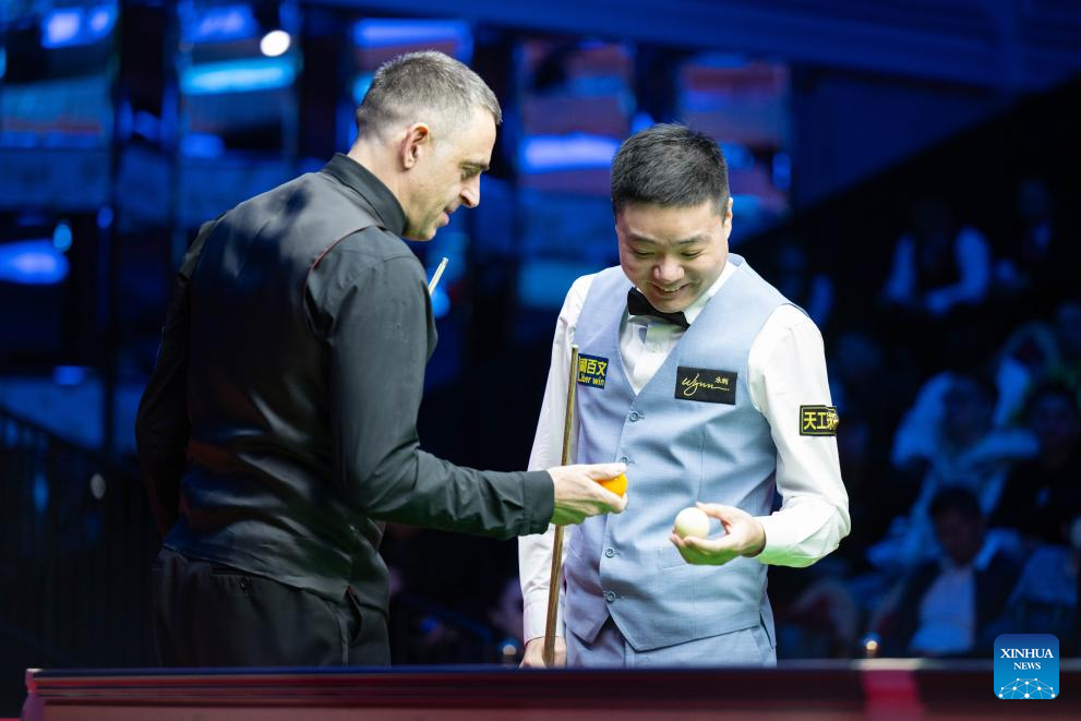 Ronnie O'Sullivan of England competes during the exhibition game against Ding Junhui of China at the 2023 Macau Snooker Masters in Macau, south China, Dec. 25, 2023. (Xinhua/Cheong Kam Ka)