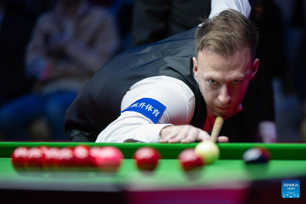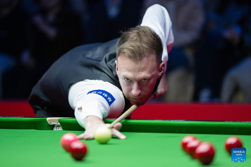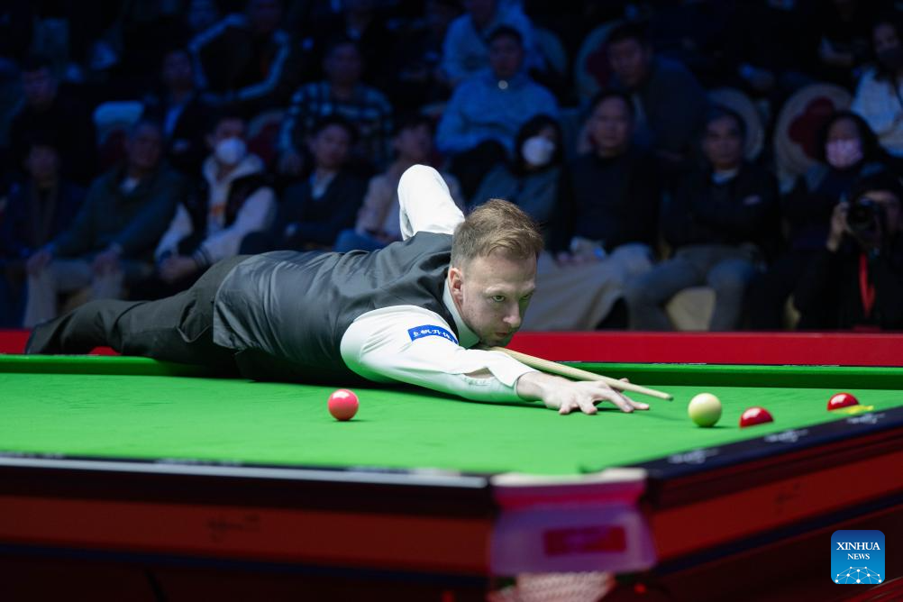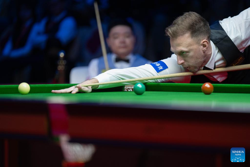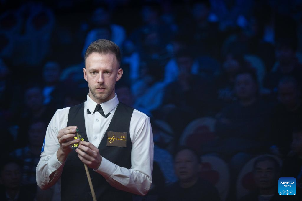Judd Trump of England competes during the group A quarter finals against Ding Junhui of China at the 2023 Macau Snooker Masters in Macau, south China, Dec. 26, 2023. (Xinhua/Cheong Kam Ka)