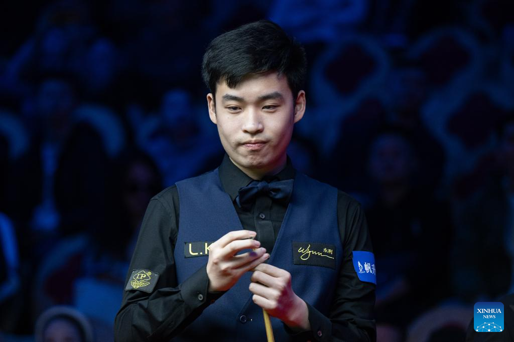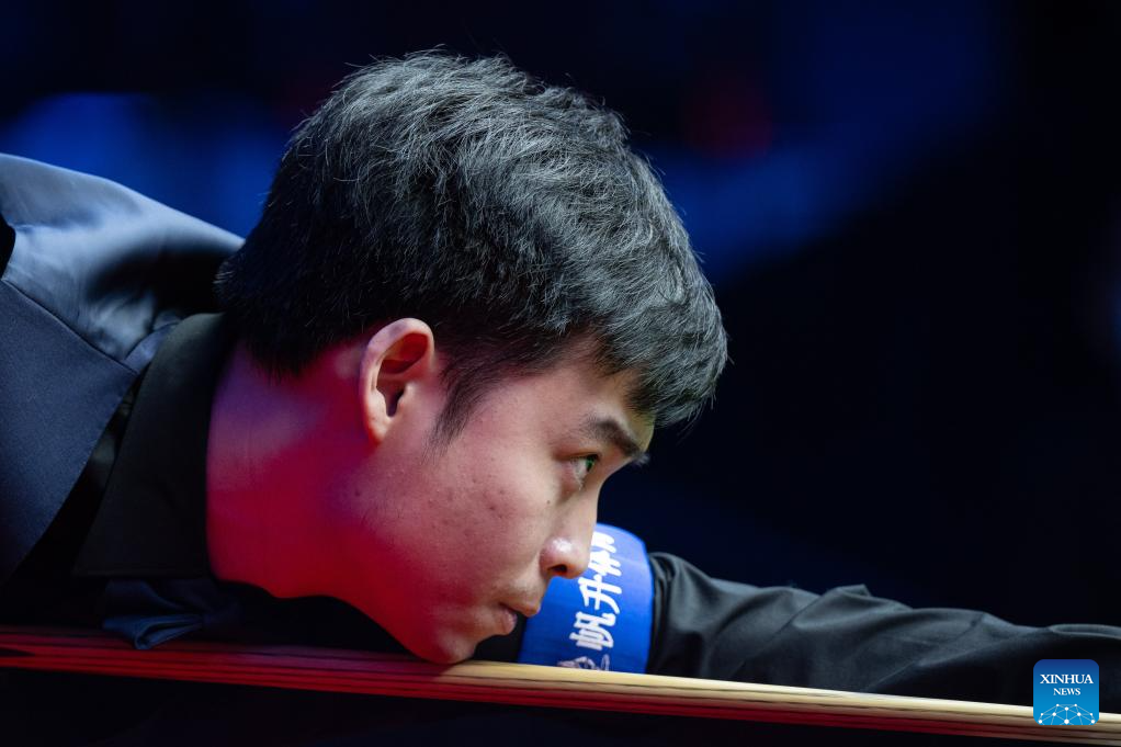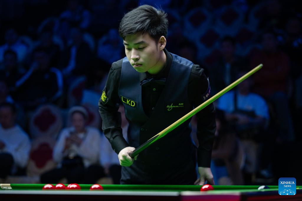 Si Jiahui of China competes during the group A quarter finals against Mark Williams of Wales at the 2023 Macau Snooker Masters in Macau, south China, Dec. 26, 2023. (Xinhua/Cheong Kam Ka)