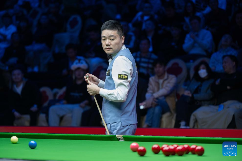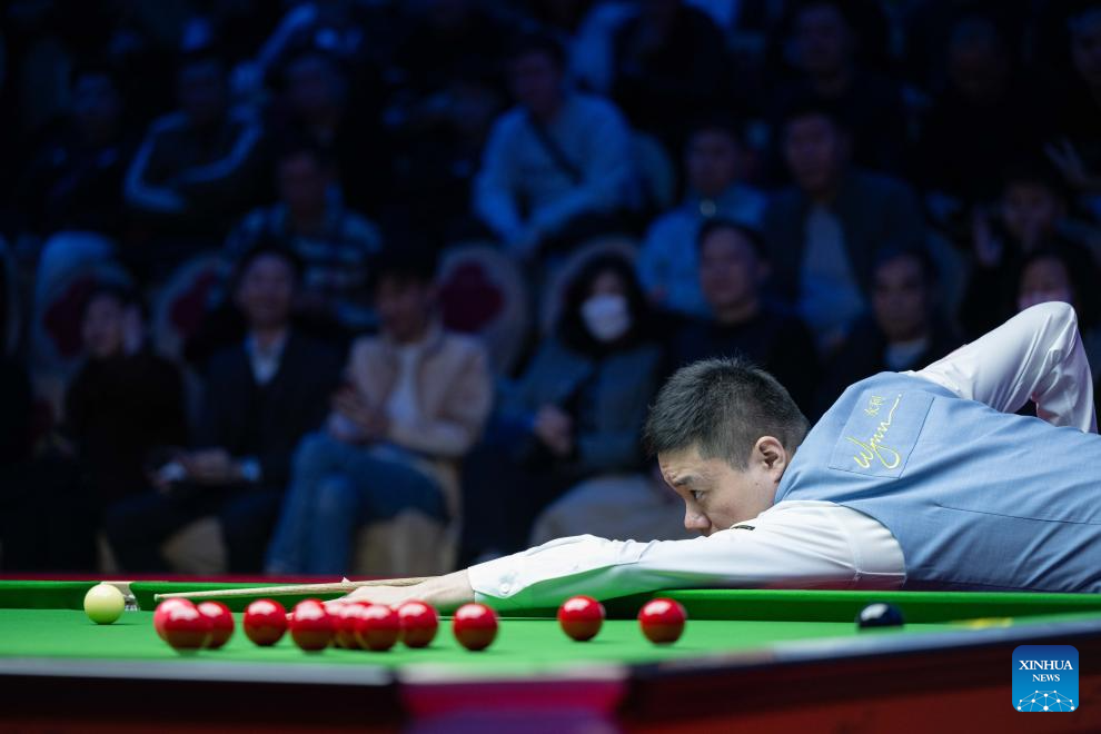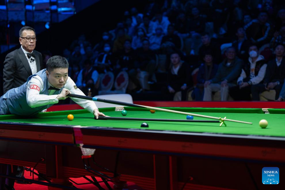 Ding Junhui of China competes during the group A quarter finals against Judd Trump of England at the 2023 Macau Snooker Masters in Macau, south China, Dec. 26, 2023. (Xinhua/Cheong Kam Ka)