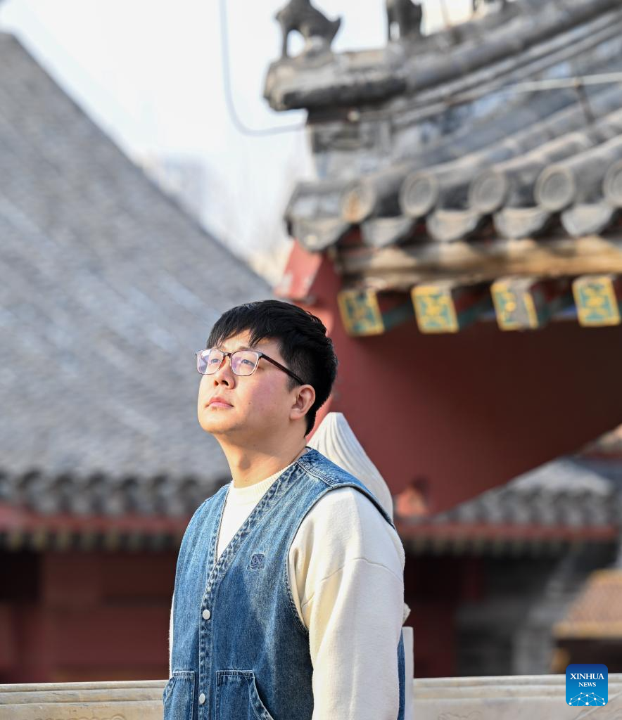 Xi Wang is seen at the Tianjin Yangliuqing picture studio in Tianjin, north China, Dec. 26, 2023. (Xinhua/Sun Fanyue)