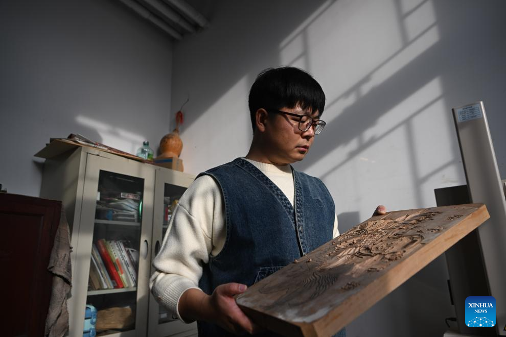 Xi Wang checks the details of a finished woodblock type at the Tianjin Yangliuqing picture studio in Tianjin, north China, Dec. 26, 2023. (Xinhua/Sun Fanyue)