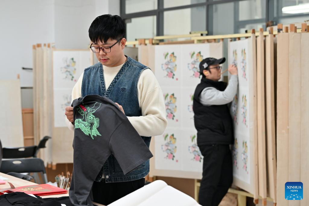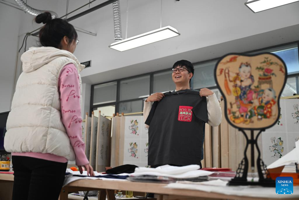 Xi Wang checks a T-shirt bearing elements of traditional new year pictures at the Tianjin Yangliuqing picture studio in Tianjin, north China, Dec. 26, 2023. (Xinhua/Li Ran)