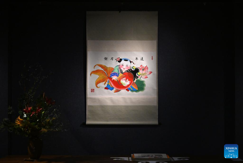 A new year picture is displayed at the Tianjin Yangliuqing Woodblock New Year Picture Museum in Tianjin, north China, Dec. 26, 2023. (Xinhua/Li Ran)