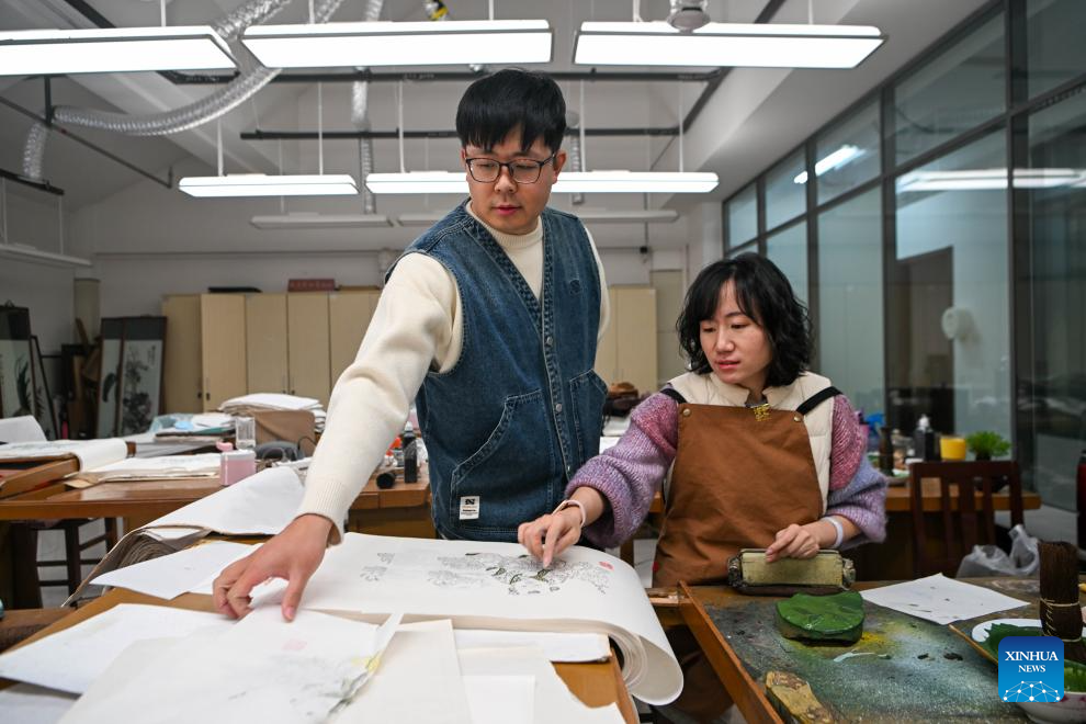 Xi Wang (L) talks with a colleague at the Tianjin Yangliuqing picture studio in Tianjin, north China, Dec. 26, 2023. (Xinhua/Sun Fanyue)
