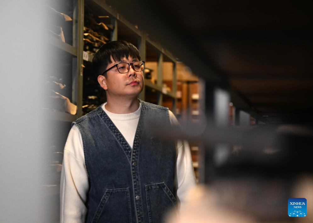Xi Wang searches for an ancient woodblock type at the Tianjin Yangliuqing picture studio in Tianjin, north China, Dec. 26, 2023. (Xinhua/Zhao Zishuo)