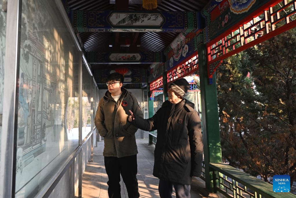 Xi Wang (L) and his mentor Wang Wenda visit a new year picture-themed park in Tianjin, north China, Dec. 27, 2023.