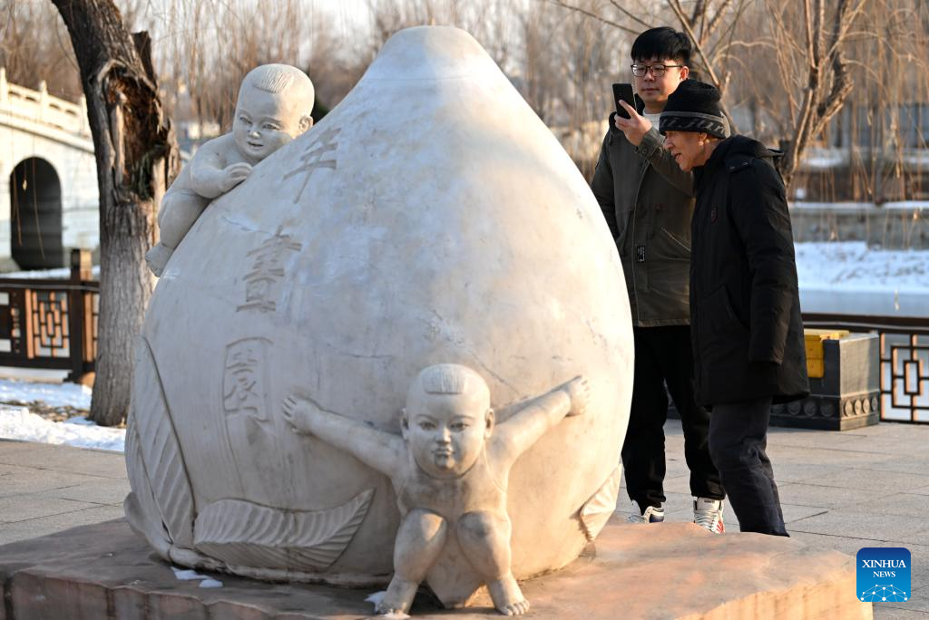 Xi Wang (2nd, L) and his mentor Wang Wenda (1st, L) watch a sculpture inspired by a typical figure in traditional new year pictures at Yangliuqing Town in Tianjin, north China, Dec. 27, 2023. (Xinhua/Li Ran)