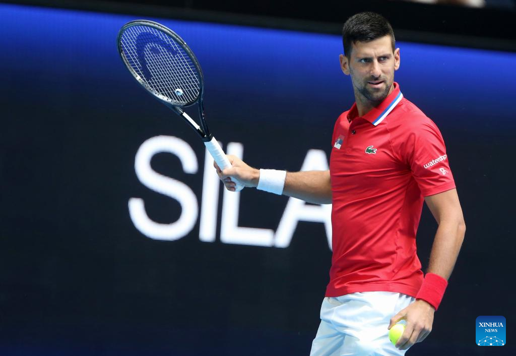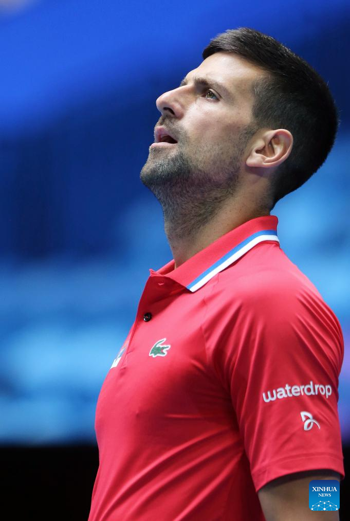 Novak Djokovic of Serbia reacts as he competes against Jiri Lehecka of the Czech Republic during the Group E match between the Czech Republic and Serbia at the 2024 United Cup tennis tournament in Perth, Australia, Jan. 2, 2024. (Photo by Zhou Dan/Xinhua)