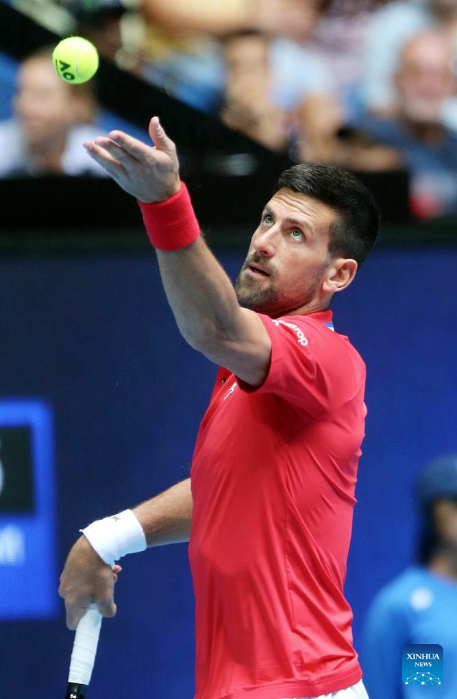 Novak Djokovic of Serbia serves to Jiri Lehecka of the Czech Republic during the Group E match between the Czech Republic and Serbia at the 2024 United Cup tennis tournament in Perth, Australia, Jan. 2, 2024. (Photo by Zhou Dan/Xinhua)