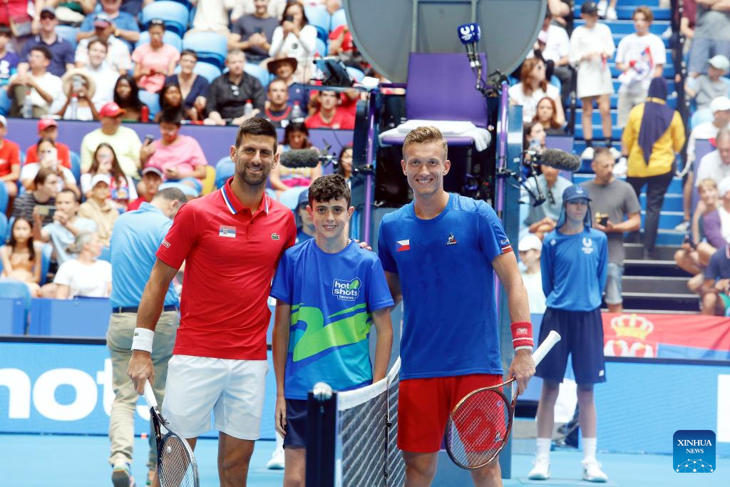 Novak Djokovic (L) of Serbia poses with Jiri Lehecka (R) of the Czech Republic before the Group E match between the Czech Republic and Serbia at the 2024 United Cup tennis tournament in Perth, Australia, Jan. 2, 2024. (Photo by Zhou Dan/Xinhua)