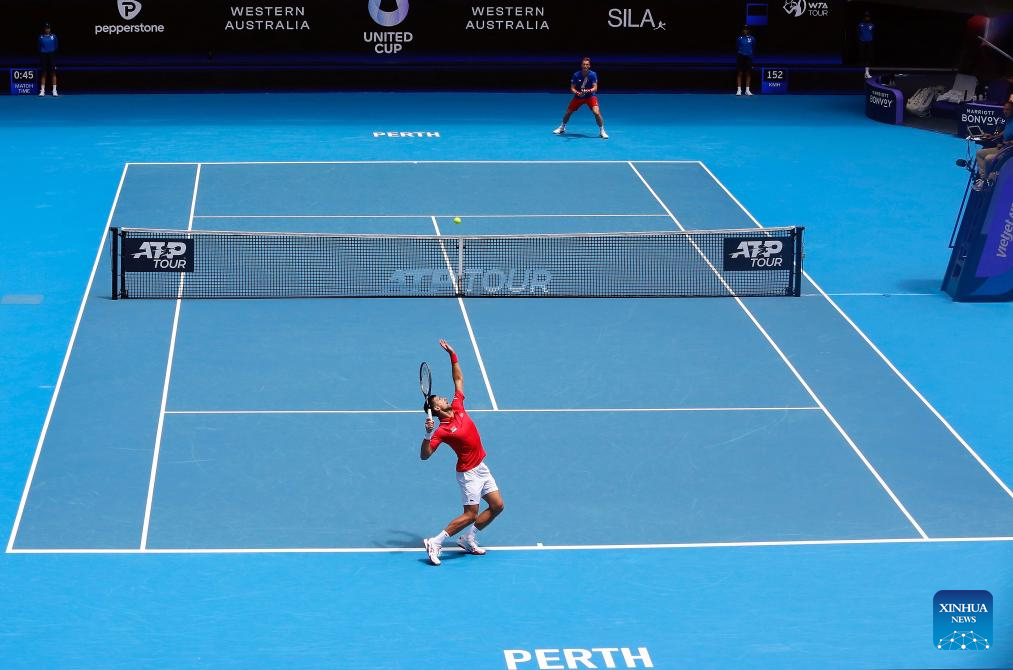 Novak Djokovic (front) of Serbia serves to Jiri Lehecka of the Czech Republic during the Group E match between the Czech Republic and Serbia at the 2024 United Cup tennis tournament in Perth, Australia, Jan. 2, 2024. (Photo by Zhou Dan/Xinhua)
