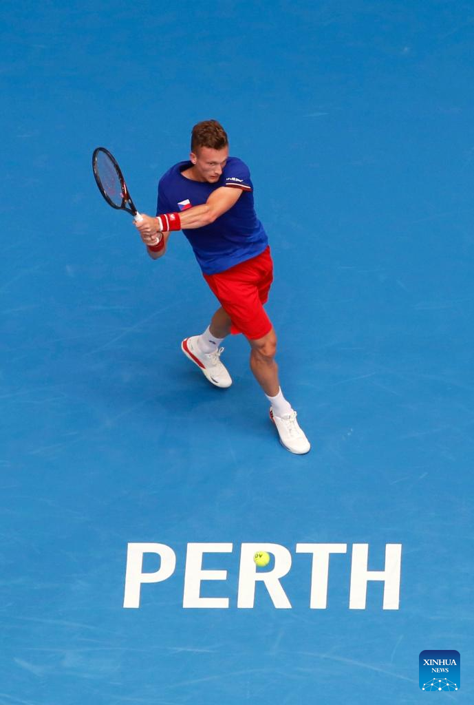 Jiri Lehecka of the Czech Republic hits a return to Novak Djokovic of Serbia during the Group E match between the Czech Republic and Serbia at the 2024 United Cup tennis tournament in Perth, Australia, Jan. 2, 2024. (Photo by Zhou Dan/Xinhua)