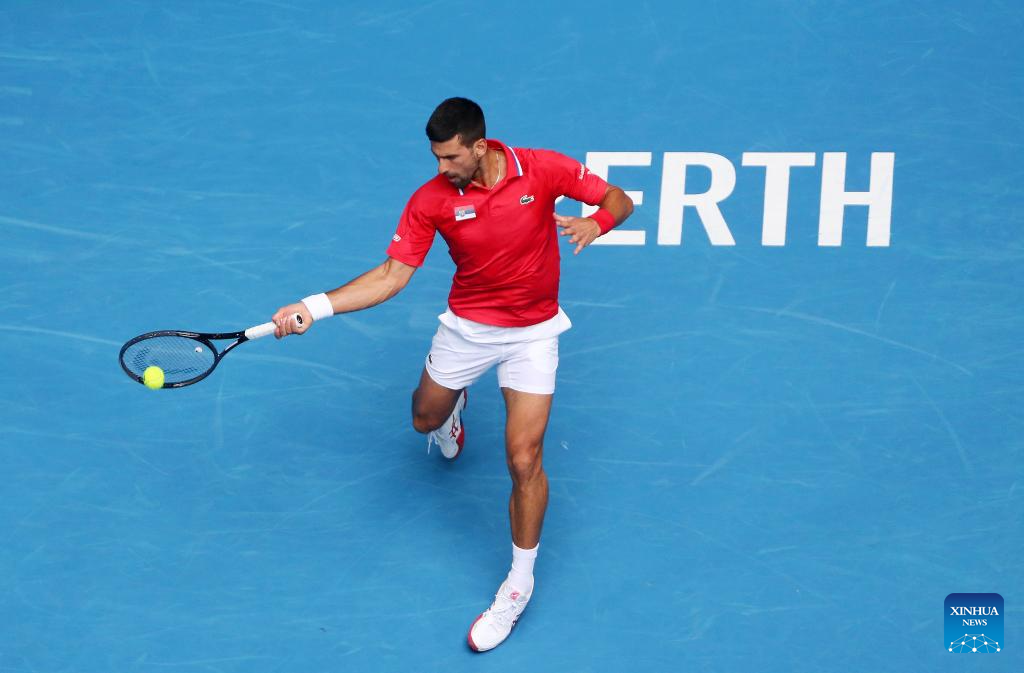 Novak Djokovic of Serbia hits a return to Jiri Lehecka of the Czech Republic during the Group E match between the Czech Republic and Serbia at the 2024 United Cup tennis tournament in Perth, Australia, Jan. 2, 2024. (Photo by Zhou Dan/Xinhua)