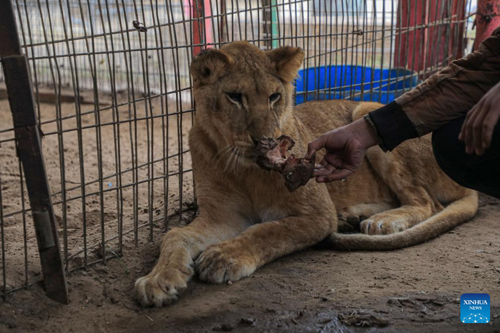 A staff member feeds a lion at a private zoo in the southern Gaza Strip city of Rafah, Jan. 2, 2024. Animals at the zoo are suffering from food shortage due to the Israel-Hamas conflict. (Photo by Rizek Abdeljawad/Xinhua)