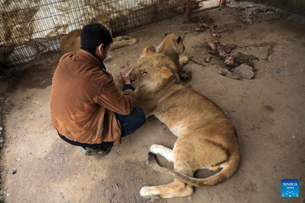 A staff member checks health conditions of lions at a private zoo in the southern Gaza Strip city of Rafah, Jan. 2, 2024. Animals at the zoo are suffering from food shortage due to the Israel-Hamas conflict. (Photo by Rizek Abdeljawad/Xinhua)