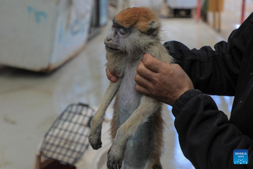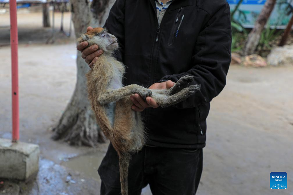 A weak monkey is pictured at a private zoo in the southern Gaza Strip city of Rafah, Jan. 2, 2024. Animals at the zoo are suffering from food shortage due to the Israel-Hamas conflict. (Photo by Rizek Abdeljawad/Xinhua)