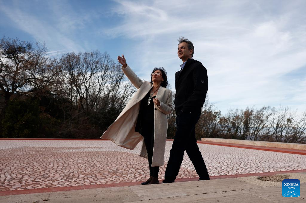 Greek Prime Minister Kyriakos Mitsotakis (R) visits the site of a palace of the ancient kingdom of Macedonia at the archaeological site of Aigai in Vergina, Greece, Jan. 5, 2024. (Photo by Dimitris Tosidis/Xinhua)