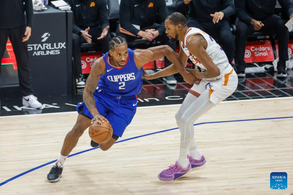Los Angeles Clippers' Kawhi Leonard (L) drives against Phoenix Suns' Kevin Durant during the 2023-2024 NBA regular season match between Los Angeles Clippers and Phoenix Suns in Los Angeles, the United States, Jan. 8, 2024. (Photo by Ringo Chiu/Xinhua)