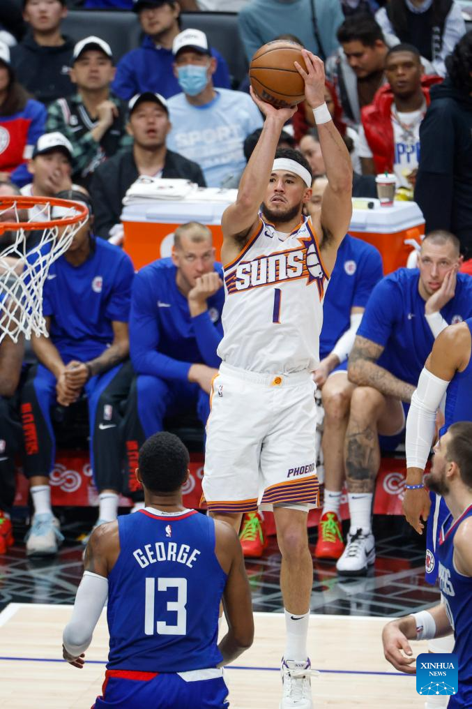 Phoenix Suns' Devin Booker (top) shoots against Los Angeles Clippers' Paul George during the 2023-2024 NBA regular season match between Los Angeles Clippers and Phoenix Suns in Los Angeles, the United States, Jan. 8, 2024. (Photo by Ringo Chiu/Xinhua)