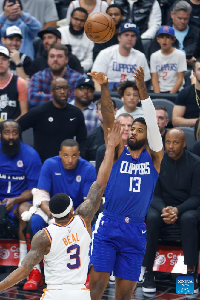 Los Angeles Clippers' Paul George (R) shoots against Phoenix Suns' Bradley Beal during the 2023-2024 NBA regular season match between Los Angeles Clippers and Phoenix Suns in Los Angeles, the United States, Jan. 8, 2024. (Photo by Ringo Chiu/Xinhua)