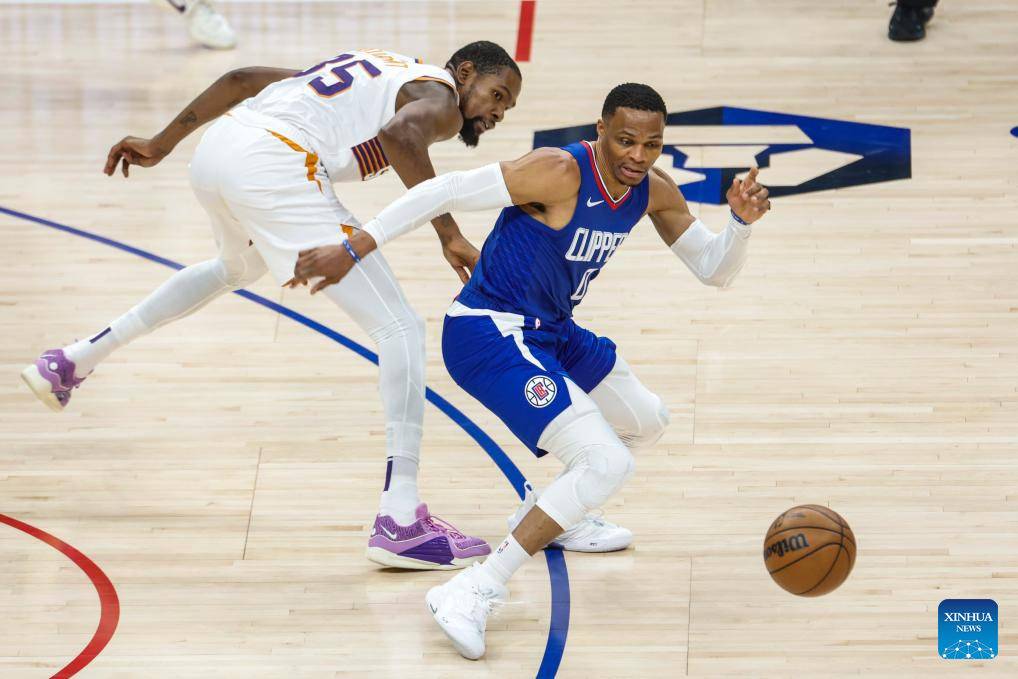 Los Angeles Clippers' Russell Westbrook (R) and Phoenix Suns' Kevin Durant vie for the ball during the 2023-2024 NBA regular season match between Los Angeles Clippers and Phoenix Suns in Los Angeles, the United States, Jan. 8, 2024. (Photo by Ringo Chiu/Xinhua)