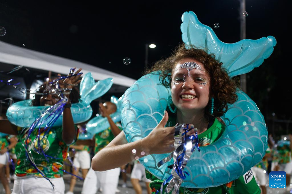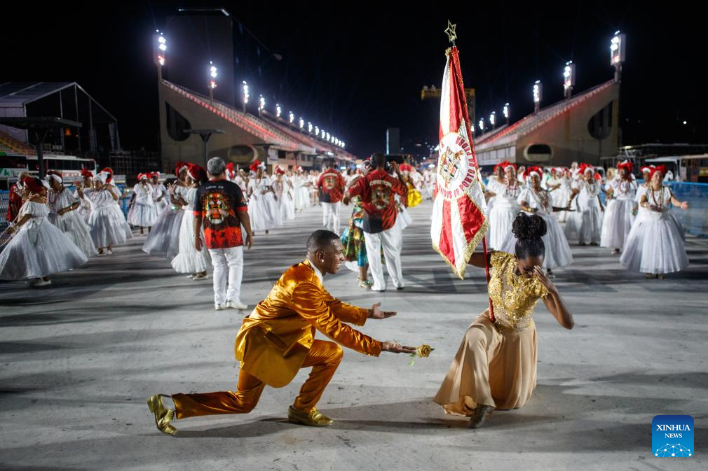 Performers participate in the first day of technical rehearsal for the carnival parade at the Sambadrome in Rio de Janeiro, Brazil, Jan. 7, 2024. (Photo by Claudia Martini/Xinhua)