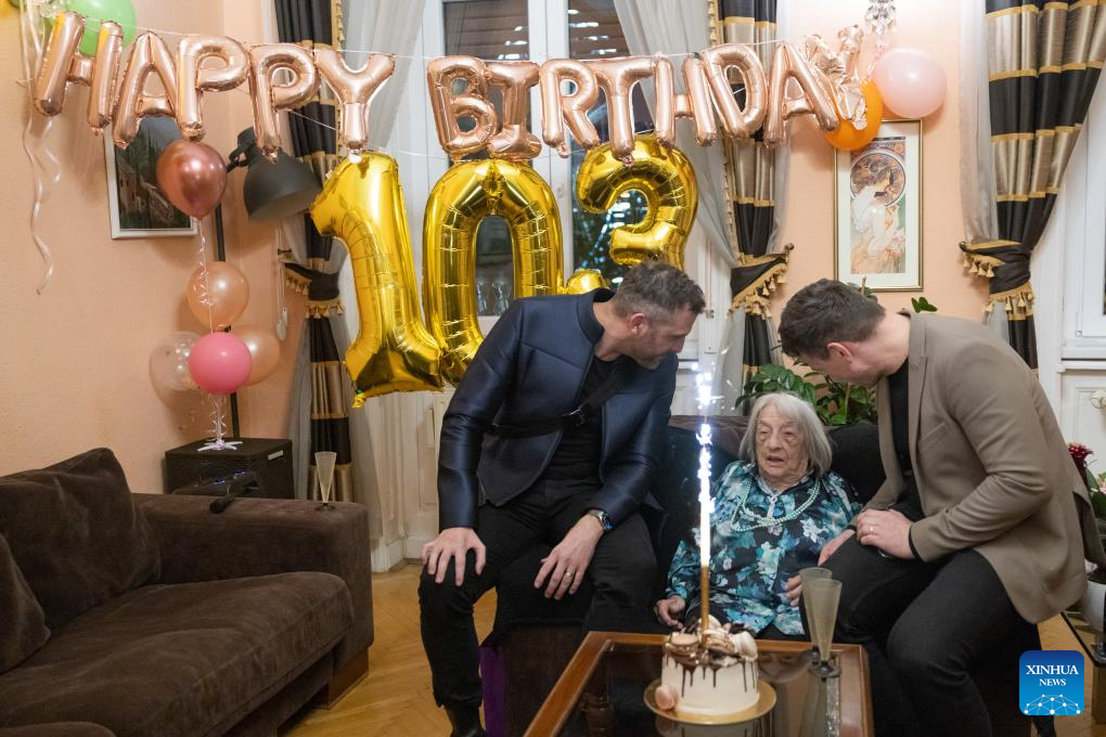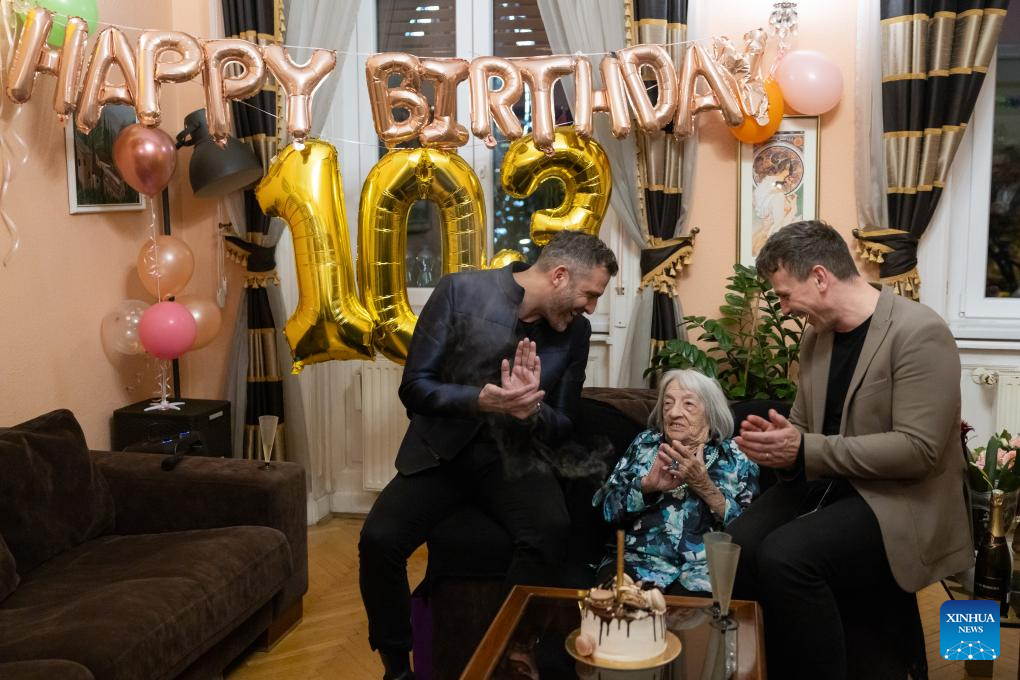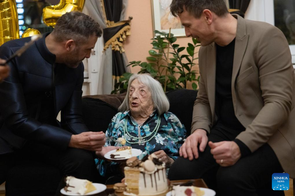 Hungarian gymnastic legend Agnes Keleti (C) celebrates her 103rd birthday in Budapest, Hungary on Jan. 9, 2024. (Photo by Attila Volgyi/Xinhua)