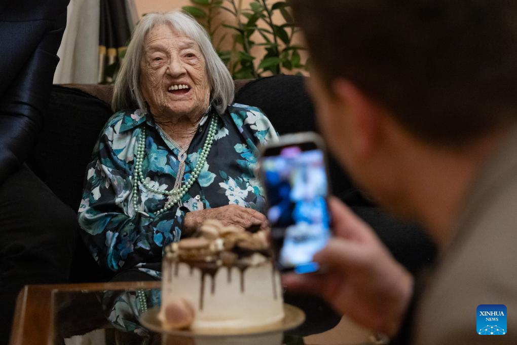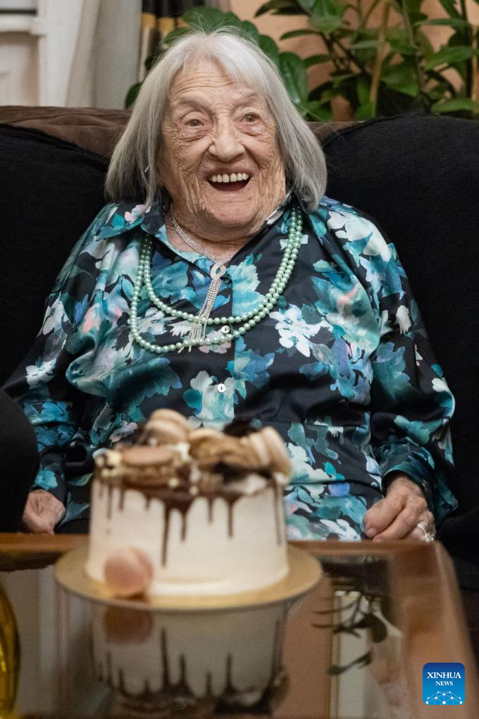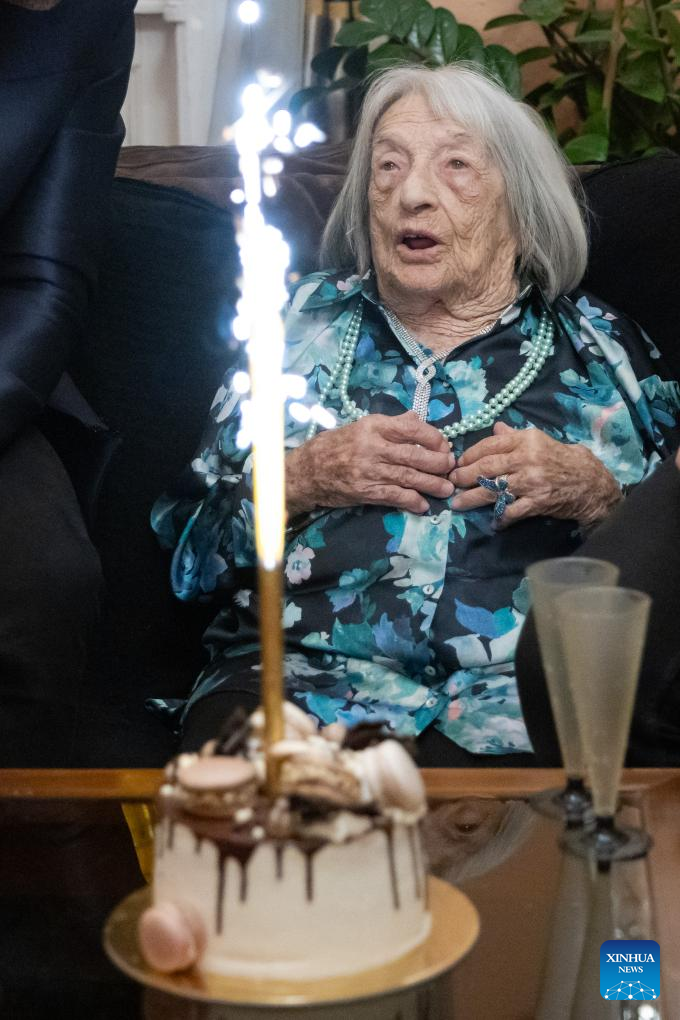 Hungarian gymnastic legend Agnes Keleti celebrates her 103rd birthday in Budapest, Hungary on Jan. 9, 2024. (Photo by Attila Volgyi/Xinhua)
