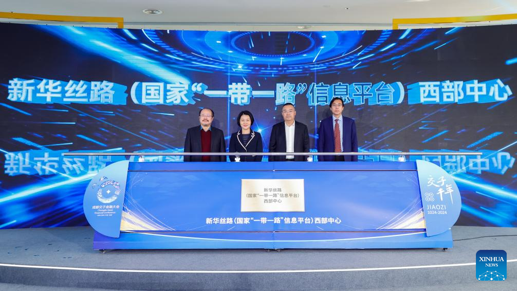 Guests attend the opening ceremony of the west China branch of Xinhua Silk Road, a national Belt and Road information service provider under Xinhua News Agency, during the Chengdu Jiaozi Financial Conference, in Chengdu, southwest China's Sichuan Province, Jan. 12, 2024. (Xinhua/Shen Bohan)