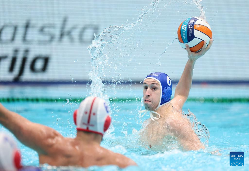 Valiko Dadvani (R) of Georgia shoots during the Men's European Water Polo Championship 1/8 final match between Georgia and Romania on Jan. 11, 2024 in Zagreb, Croatia. (Sanjin Strukic/Pixsell via Xinhua)