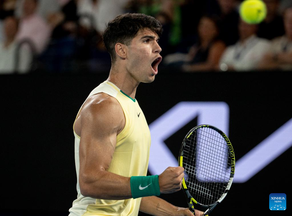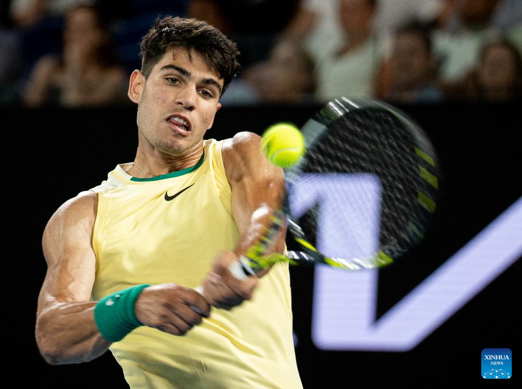 Carlos Alcaraz of Spain hits a return during the men's singles first round match between Carlos Alcaraz of Spain and Richard Gasquet of France at the Australian Open tennis tournament in Melbourne, Australia on Jan. 16, 2024. (Photo by Hu Jingchen/Xinhua)