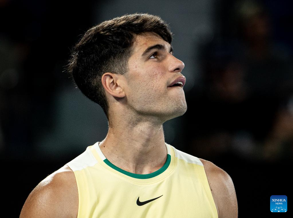 Carlos Alcaraz of Spain reacts during the men's singles first round match between Carlos Alcaraz of Spain and Richard Gasquet of France at the Australian Open tennis tournament in Melbourne, Australia on Jan. 16, 2024. (Photo by Hu Jingchen/Xinhua)
