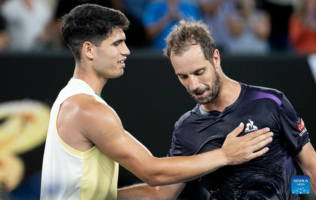 Carlos Alcaraz (L) of Spain and Richard Gasquet of France greet each other after the men's singles first round match at the Australian Open tennis tournament in Melbourne, Australia on Jan. 16, 2024. (Photo by Hu Jingchen/Xinhua)