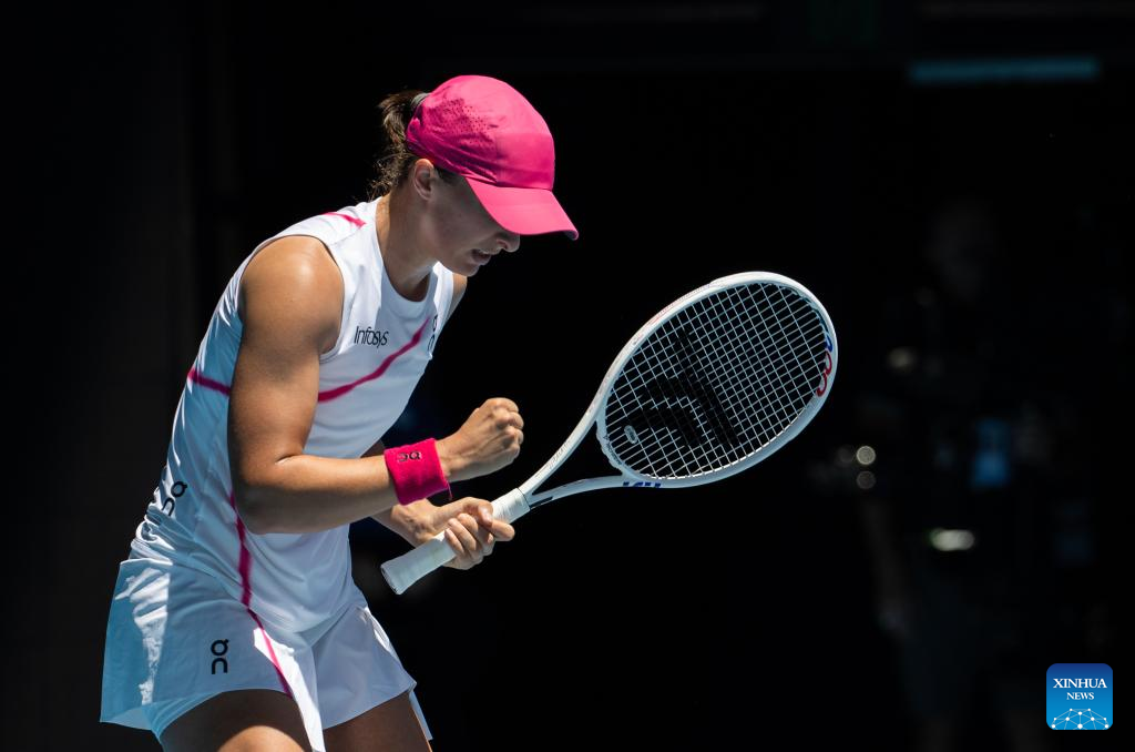 Iga Swiatek of Poland celebrates during the women's singles 1st round match between Iga Swiatek of Poland and Sofia Kenin of the United States at Australian Open tennis tournament in Melbourne, Australia, Jan. 16, 2024. (Photo by Hu Jingchen/Xinhua)