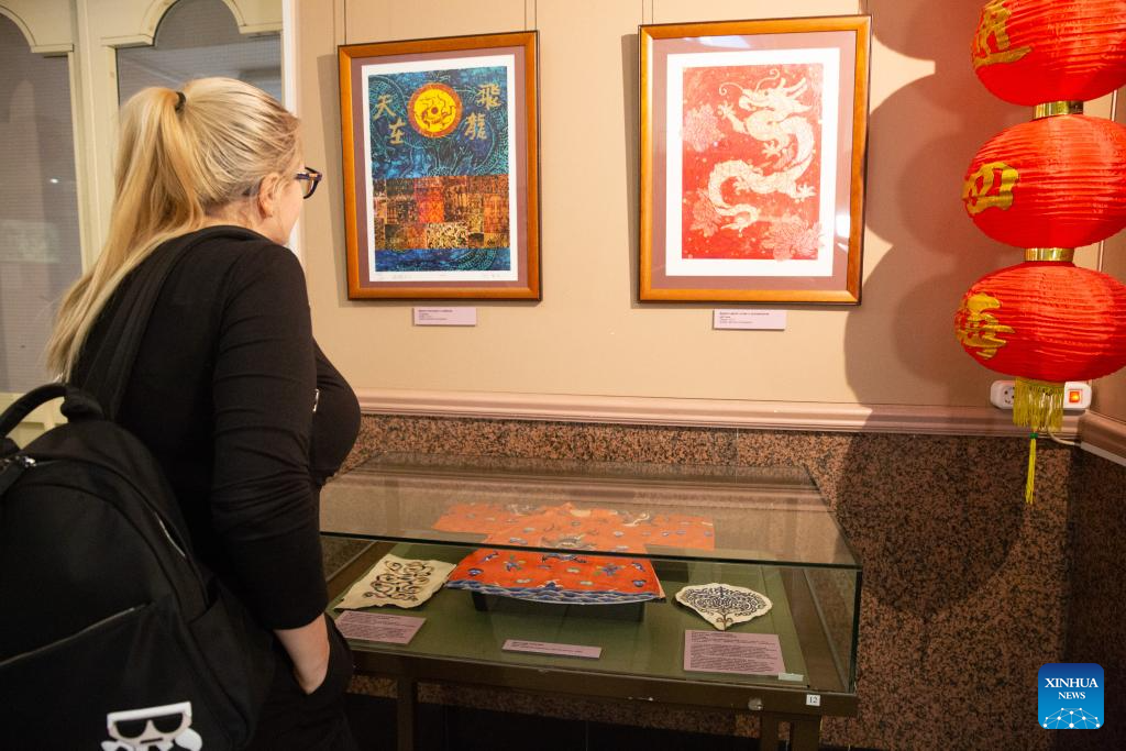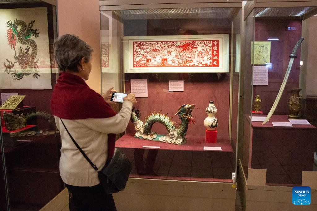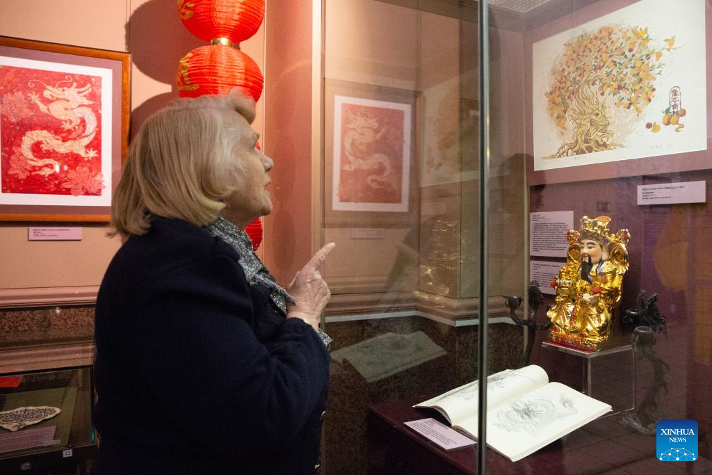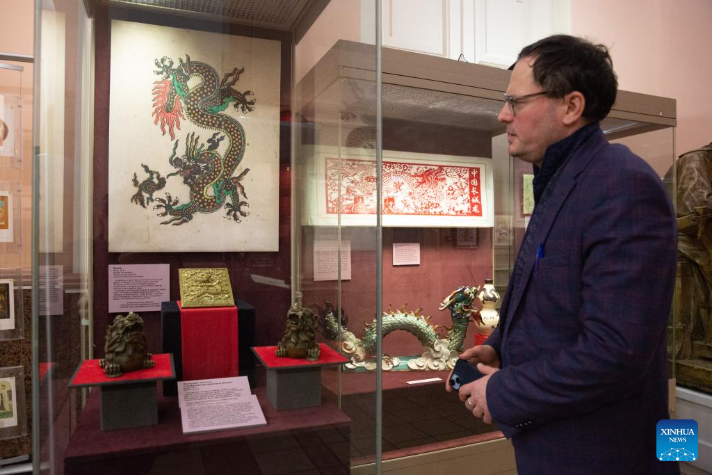 A man visits a dragon-themed exhibition in St. Petersburg, Russia, Jan. 18, 2024. A dragon-themed exhibition was held in Russia's St. Petersburg to welcome the upcoming Chinese zodiac Year of the Dragon. (Photo by Irina Motina/Xinhua)