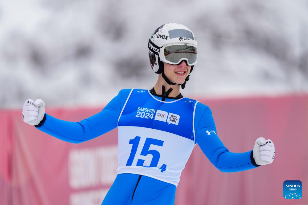 Enej Faletic of Slovenia reacts after the second round game of the Mixed Team of Ski Jumping event at the Gangwon 2024 Winter Youth Olympic Games in Pyeongchang, South Korea, Jan. 21, 2024. (Xinhua/Zhang Xiaoyu)