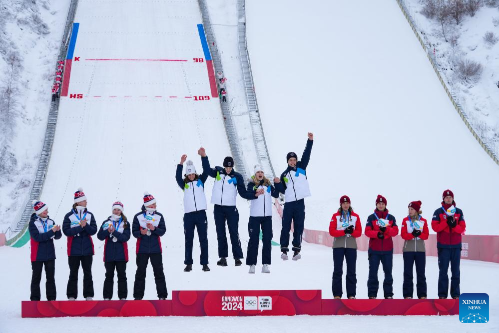 Gold medalists team Slovenia (C), silver medalists team Norway (L) and bronze medalists team Austria take group photos during the award ceremony of Mixed Team for Ski Jumping event at the Gangwon 2024 Winter Youth Olympic Games in Pyeongchang, South Korea, Jan. 21, 2024. (Xinhua/Zhang Xiaoyu)